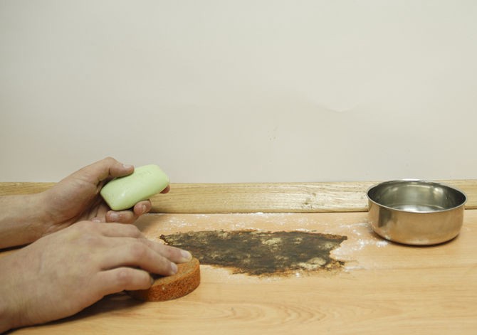 Lưu ý đối với vết bẩn này tuyệt đối không dùng nước để lau, nên dùng bột gạo hoặc bột mì để làm sạch. Rắc bột lên vết bẩn, sau đó lấy bàn chải chà lên vết bẩn, dùng nước lau sàn để lau sạch lại sàn nhà.